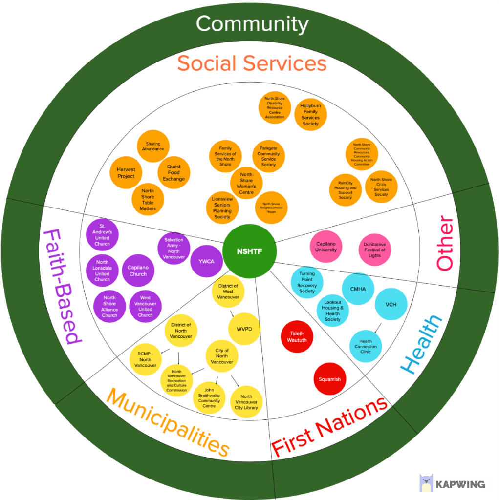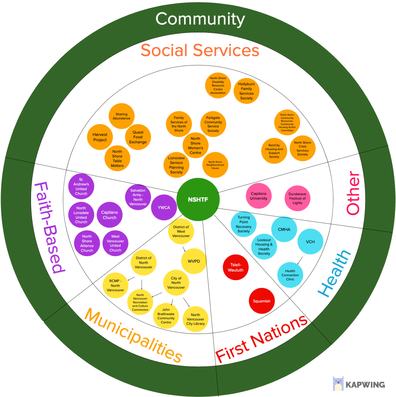 The North Shore Homelessness Task Force utilizes a partnership-based approach to address the issues related to eliminating and preventing homelessness on the North Shore. This approach allows us to build upon the services and facilities that already exist in the community to help and support those who find themselves without a place to live or who are at risk of becoming homeless. For a more in depth look at our membership, check out our Relationship Map. Interested in getting involved? Contact us!